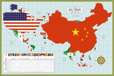 Benjamin Edwards’ work The World of Wal Mart displays the countries of origins of objects sold in Wal Mart stores.