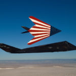 Two specially painted F-117 Nighthawks fly on one of their last missions. The F-117s were retired March 11 in a farewell ceremony at Wright-Patterson Air Force Base, Ohio. (U.S. Air Force photo/Senior Master Sgt. Kim Frey)